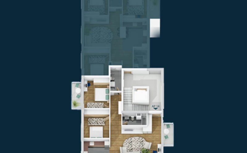 Singurul apartament rămas disponibil are 3 camere şi se află la etajul 5: Suprafaţa utilă – 85.68mp, Suprafaţă terasă – 9.48 mp. Avans minim 30%.