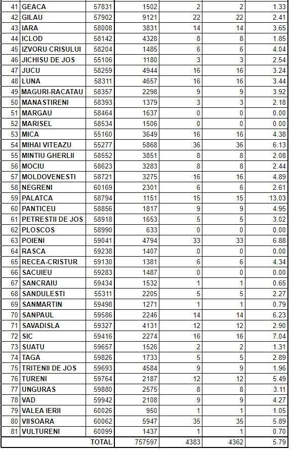 Pe lângă Cluj-Napoca, pe "lista roșie" COVID se află mai află zeci de localități, însă conduc cu cele mai mari rate de infectare comunele Palatca, cu 13,03 cazuri la mie, Gârbău, cu 10,89, Ciucea, cu 9,18 și Călărași, cu 8,03.