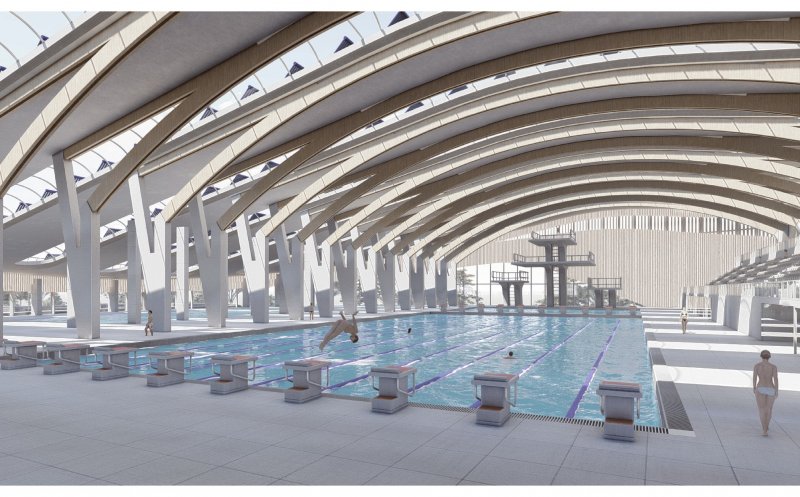 Clădirea acoperită va avea o capacitate de 1000 de spectatori și un volum unitar ce cuprinde zone dedicate competițiilor sportive de natație ce includ: un bazin olimpic de înot, un bazin olimpic de sărituri, o zonă de gradene pentru spectatori, zone de agrement, un bazin de inițiere, saune, jacuzzi, vestiare și o zonă administrativă.
