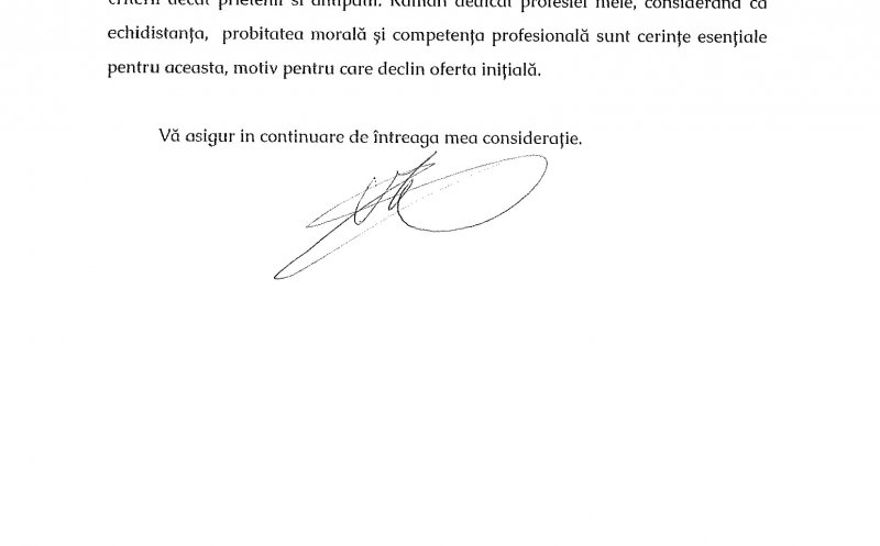 Intenționez să îmi păstrez aceeași modalitate de selectare a clienților, pe alte criterii decât prietenii și antipatii. Rămân dedicat profesiei mele, considerând că echidistanța, probitatea morală și competența profesională sunt cerințe esențiale pentru aceasta, motiv pentru care declin oferta inițială", mai arată avocatul, în scrisoarea remisă CJ Cluj.