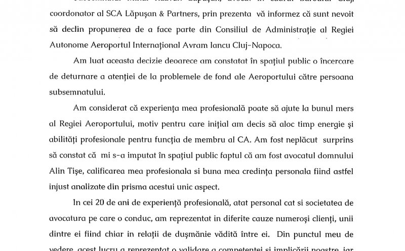 Avocatul Mihai-Răzvan Lăpușan a adresat o scrisoare Consiliului Județean (CJ) Cluj, prin care a anunțat că declină propunerea de a face parte din Consiliului de Administrație al Aeroportului Internaţional "Avram Iancu" din Cluj.