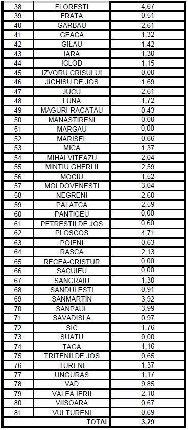 Rata îmbolnăvirilor rămâne una ridicată în comuna Florești - 4,67 la mie, dar în scădere față de finalul săptămânii trecute, când era 5,48. Iată lista cu rata incidenței infecțiilor cu noul coronavirus în fiecare unitate administrativ-teritorială a județului: