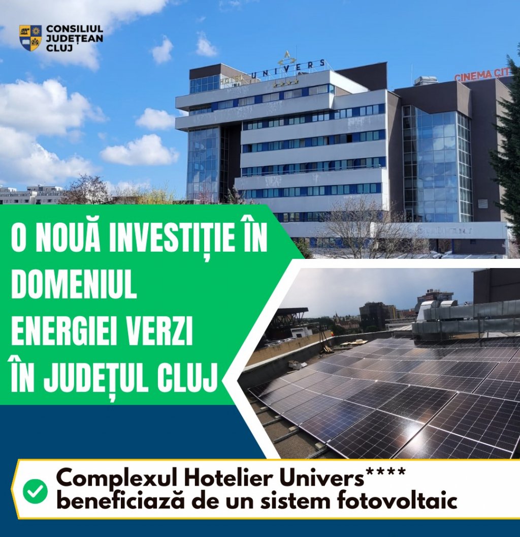 Complexul hotelier Univers****, al cărui acționar unic este Consiliul Județean Cluj, a finalizat recent lucrările de achiziție și montaj a unui sistem fotovoltaic cu o putere instalată de 80,8 KW.