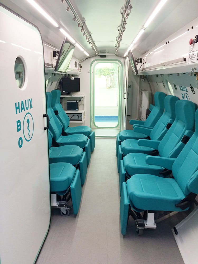Sistemul de terapie hiperbară include o cameră cu capacitate de opt pacienți și doi asistenți, o stație de control computerizată pentru monitorizare și supraveghere, instalații de încălzire și răcire, compresoare de înaltă și joasă presiune, precum și echipamente medicale specializate, precum defibrilator și ventilator hiperbaric. De asemenea, dotarea cuprinde măști de respirație, injectomate și cărucioare pentru transportul pacienților.