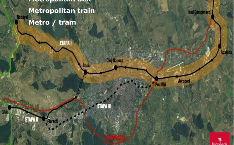 • În prima etapă va fi realizat Trenul Metropolitan pe infrastructura feroviară actuală. În această fază va fi implementat un sistem de transport rapid care va acoperi întregul coridor feroviar cuprins între halta Nădășelu și stația de la Bonțida, pe o lungime de aproximativ 43 de km.