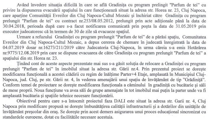 Consilierii locali vor dezbate în şedinţa din 10 septembrie 2019 proiectul de hotărâre "privind aprobarea indicatorilor tehnico-economici pentru obiectivul de investiții „Lucrări de modificare interioară în vederea amenajării unui spațiu de învățământ (grădiniță), str. Gării nr. 4, Cluj-Napoca – proiect din inițiativa primarului". Clădirea va fi modificată pe un regim de înălţime P+4E, la parter urmând să fie amenajate bucătăria, sălile de mese, cabinetul medical şi zone administrative, iar săli pentru grupele de copii la etaje. În imobil vor putea fi găzduiţi 126 de copii în 9 grupe. Durata de realizare a investiţiei: 12 luni. Valoarea investiţiei: 2.8 milioane euro.