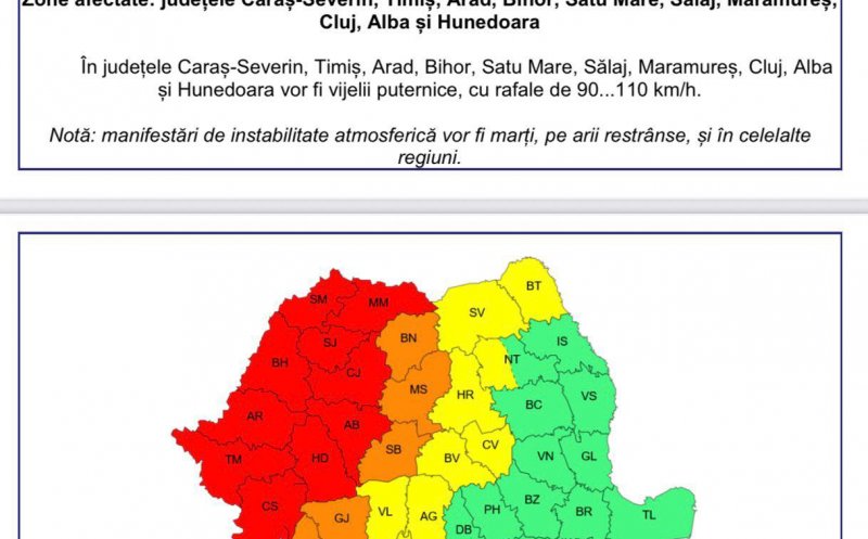 Județul Cluj se află astăzi sub incidența unui cod roșu de vreme severă, valabil între orele 15:00 și 21:00. Sunt prognozate vijelii puternice, cu rafale de vânt ce pot atinge viteze între 90 și 110 km/h.