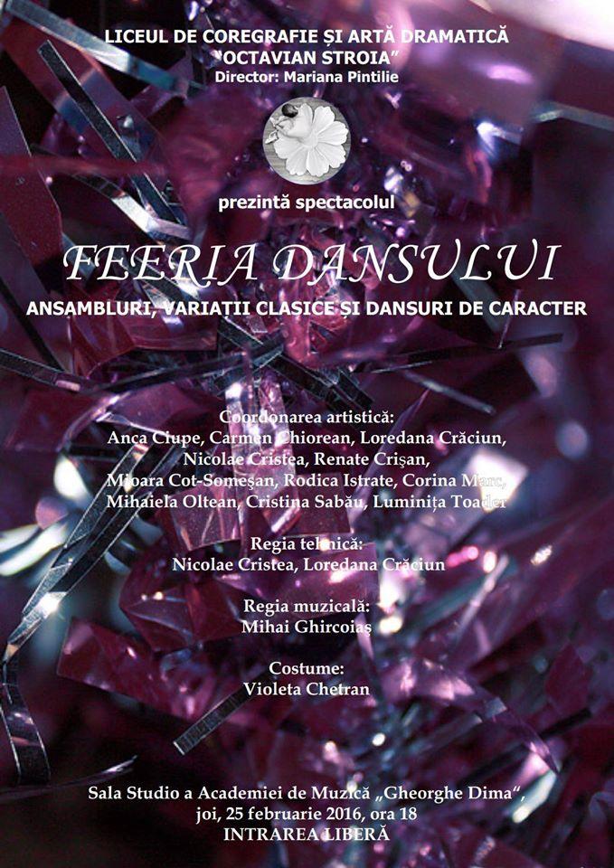 "Feeria Dansului", reprezentația de joi, 25 februarie, este susținută de către elevii clasei a IV a si ai celor din gimnaziu a școlii de coregrafie. În cadrul spectacolului veți putea vedea momente coregrafice interpretate de ansambluri, variații clasice de balet și dansuri ale popoarelor, numite dansuri de caracter care cuprind dansuri folclorice autentice sau stilizate, specifice anumitor zone geografice şi grupuri etnice, iar vineri, 26 februarie, tot la Sala Studio a Academiei de Muzică "Gheorghe Dima", va fi prezentat spectacolul de dans "Reverie", care aduce pe scană elevii claselor de liceu cu momente de dans modern și contemporan, un spectacol luxuriant, plin de ritm și culoare.