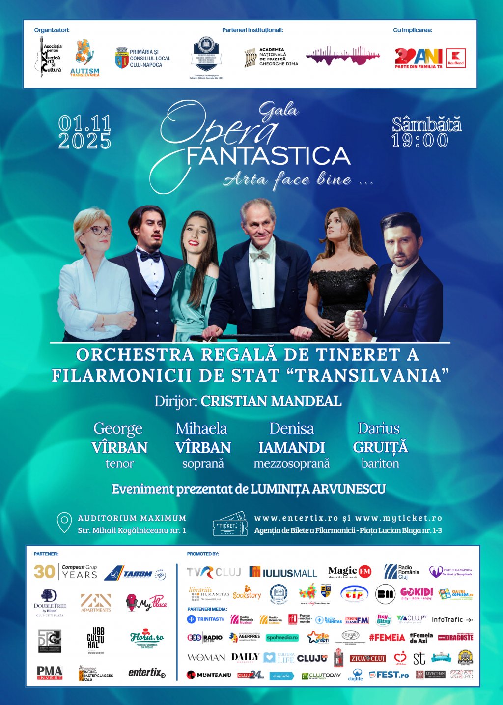 Sâmbătă, 1 noiembrie 2025, începând cu ora 19:00 (accesul în sală se face începând cu ora 18:30), la Auditorium Maximum din cadrul Universității Babeș-Bolyai din Cluj-Napoca (Strada Emmanuel de Martonne, nr. 1 - colţ cu M. Kogălniceanu), Asociația pentru Muzică, Artă și Cultură din București și Asociația Autism Transilvania din Cluj-Napoca, cu implicarea Kaufland România, Primăriei și Consiliului Local Cluj-Napoca, Universității Babeș-Bolyai din Cluj-Napoca, Academiei Naționale de Muzică „Gheorghe Dima” și a Filarmonicii de Stat „Transilvania”, în parteneriat cu Compexit Grup, Tarom, Double Tree by Hilton Cluj-Napoca, Zen Apartments Cluj-Napoca, My Place Cluj-Napoca, PMA Invest Cluj-Napoca, Florăriile Floriadin București și Bogdan Meseșan Photography, organizează GALA OPERA FANTASTICA 2025.