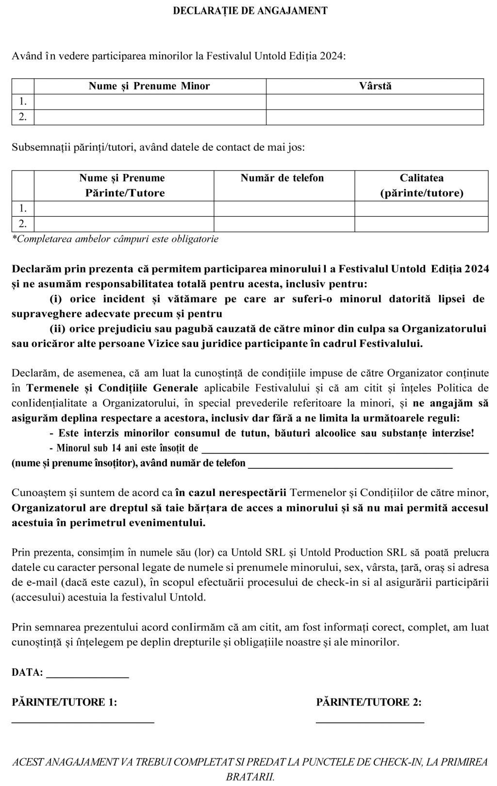 "Consimţământul Parental" poate fi descărcat de pe site-ul UNTOLD. Acest angajament trebuie completat şi predat la punctele de check-in, la primirea brăţării.