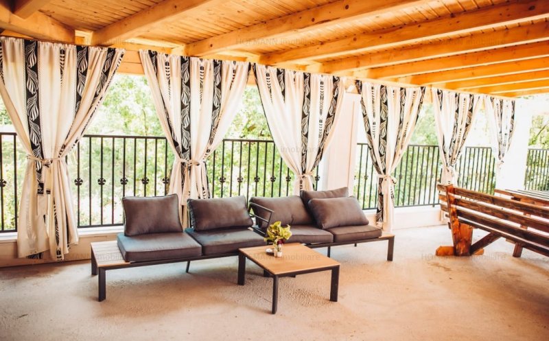 Curtea amenajata dispune de piscina, barbeque, sauna, jacuzzi, foisor, loc acoperit pentru luat masa sau gatit, totul acompaniat de sunetul placut al paraului care se afla langa proprietate'', se arata in anuntul imobiliar.