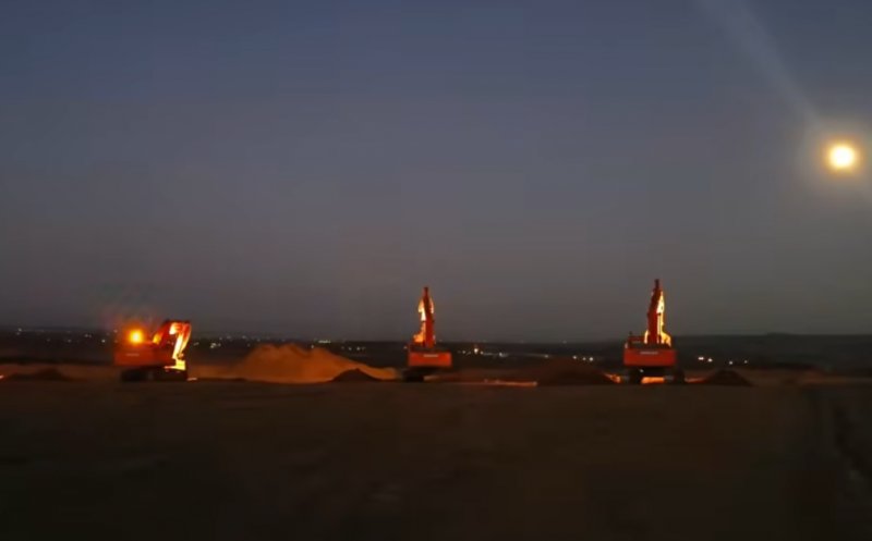 Se pare că antreprenorul nu vrea să piardă vremea, așa că profită și de ultima rază de lumină - șantierul este activ și după apusul soarelui, la lumina lunii.