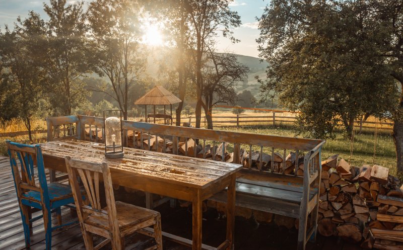 În exteriorul casei beneficiați de o terasă spațioasă, pregătită să găzduiască mese gustoase împreună cu familia și prietenii, înconjurați de frumusețea naturii. Scările mari de lângă zona de ședere ce are vizibilitate la grădină sau la fântână pot fi folosite ca și gradene pentru serile cu proiecție de film. Șura este gândită în două zone principale: zona de luat masa și zona de relaxare sau de lucru în zilele când se dorește detașarea de mediul cotidian.