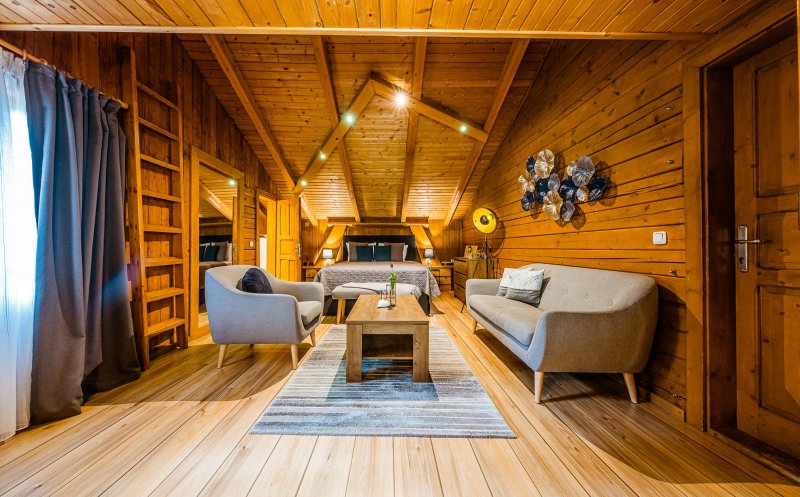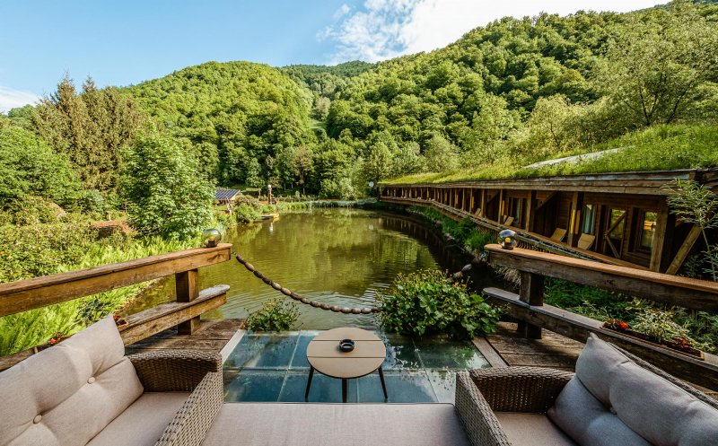 "O pensiune toată bătută în piatră, lemn și flori roșii își întâmpină oaspeții cu camere moderne și terase boeme pentru cafele și pierdut privirea-n verde. Totul e din lemn, interior și exterior. Arhitectura se încadrează în stilul rustic local, dar interiorul camerelor îmbrăcate în lemn are atmosfera de cabană contemporană. Sunt 10 camere cu balcoane deasupra lacului, alte 7 camere în corpul principal (două dintre ele au terasă proprie și ciubăr privat cu aeromasaj) și 4 apartamente (unul cu suprafață de 48mp, duș și cadă cu hidromasaj; terasa acestuia este deasupra cascadei; alte două apartamente au ciubăr privat).