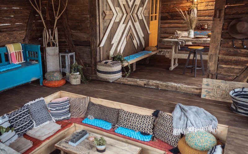 Prispa transformată în loc de odihnă contopeste spațiul interior cu cel exterior, fiind spațiul ideal pentru a te odihni în mijlocul naturii, iar colecția de farfurii și obiecte ceramice îti dau întâlnire cu cele două mari stiluri ceramice românești: Horezu și Corun.