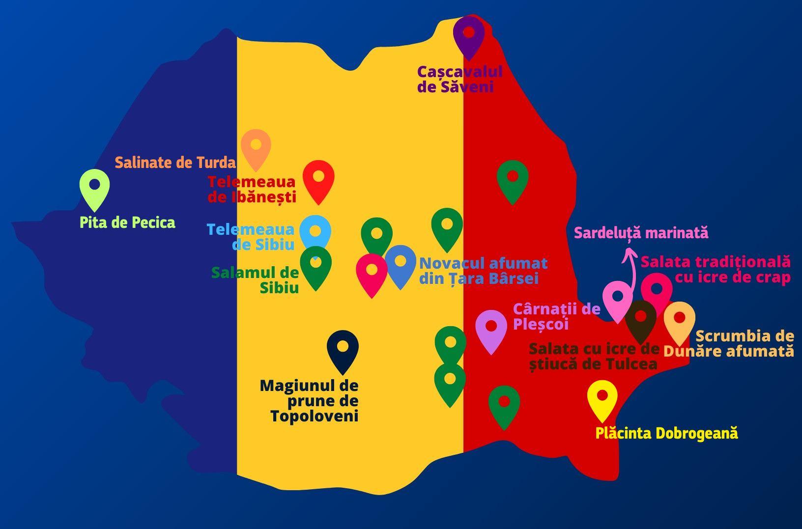 Pe „traseu" avem: Telemeaua de Sibiu, Cârnații de Pleșcoi, Scrumbia de Dunăre afumată, Novacul afumat din Țara Bârsei, Telemeaua de Ibănești, Salamul de Sibiu, Magiunul de prune de Topoloveni, Cașcavalul de Săveni, Salata cu icre de știucă de Tulcea, Salata tradițională cu icre de crap, Plăcinta Dobrogeană, Pita de Pecica, Salinate de Turda şi Sardeluța marinată", scrie pe pagina de Facebook a Reprezentanței Comisiei Europene în România.
