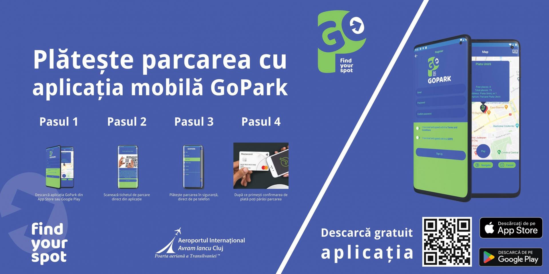„Aeroportul Internaţional Avram Iancu Cluj vine în sprijinul utilizatorilor parcării Est! Pe lângă modalităţile actuale de plată a parcării, vă punem la dispoziţie şi aplicația mobilă GoPark!