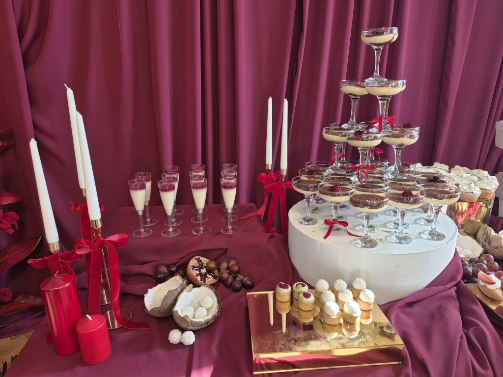 În materie de dulciuri, candy bar-urile rămân în trend. Prăjiturelele în formă de fructe și combinațiile de pachete cu fructe sunt preferate, iar prețurile pornesc de la 25 lei/persoană pentru candy bar și 15 lei/persoană pentru felii de tort, au spus cei de la Cakes by Lavi.