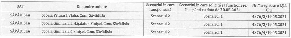 Astfel, toți elevii din încă 9 școli din județ, pe lângă cele care sunt deja în scenariul verde (scenariul 1 de funcționare), vor merge de joi la școală. Pe de altă parte, Școala Gimnazială Săcuieu și Școala Gimnazială Rogojeu din comuna Săcuieu trec în scenariul 2, adică vor merge la școlală doar elevii din clasele primare și cei din clasele a VIII-a.