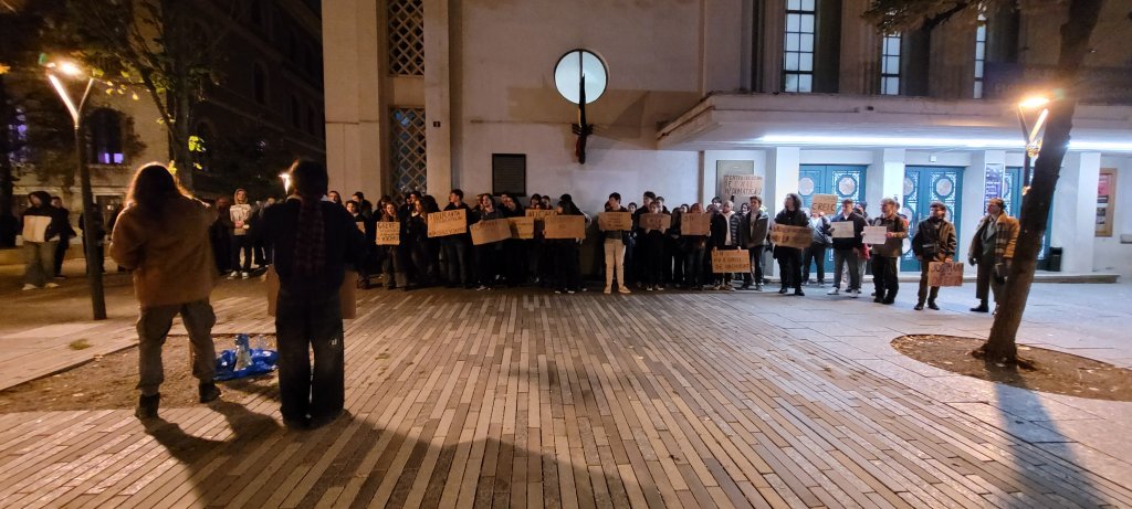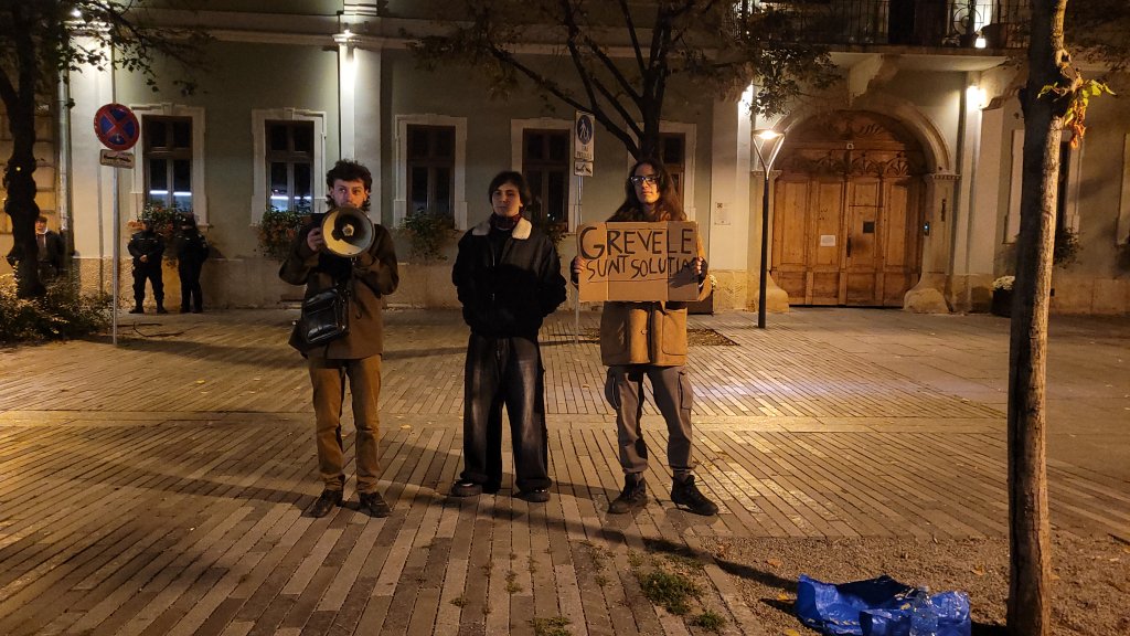 Studenții de la Facultatea de Matematică-Informatică a UBB protestează în fața Auditorium Maximum, unde ministrul Daniel David participă la un eveniment pe tema educației.