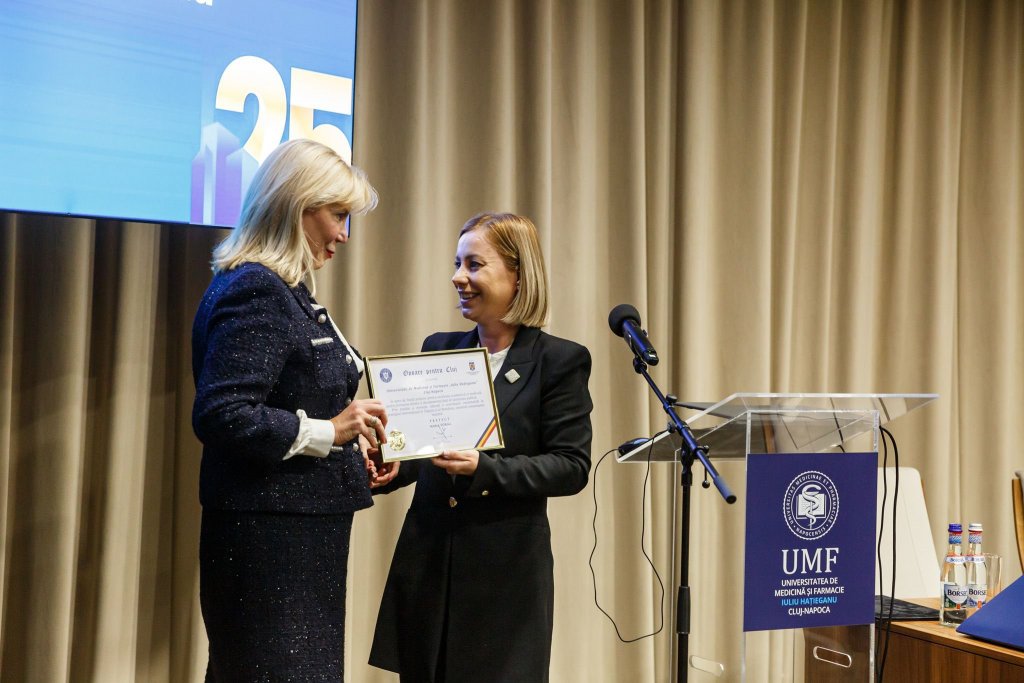 Cu prilejul aniversării, prefectul Maria Forna i-a înmânat rectorului Anca Buzoianu cea mai înaltă distincție acordată de Instituția Prefectului – Județul Cluj, „Onoare pentru Cluj”. Distincția recunoaște excelența academică, contribuția la formarea elitelor medicale și rolul UMF în promovarea prestigiului internațional al județului.