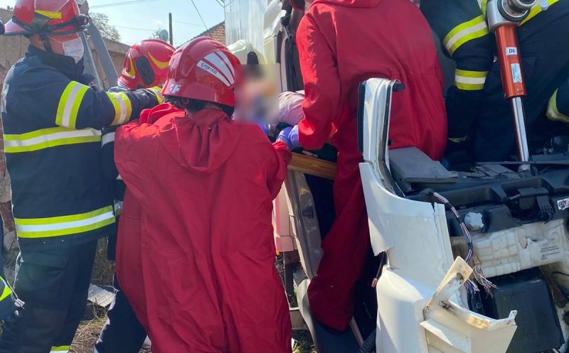 UPDATE: Intervenția pentru descarcerarea bărbatului din cabina camionului a fost una extrem de dificilă, după cca. o oră, timp în care bărbatul a primit asistență medicală de urgență (a primit lichide și sedative intravenos, i s-a pus guler cervical, iar medicii au comunicat cu el în cea mai mare parte a timpului cât au durat stabilizarea autovehiculului, asigurarea accesului către victimă, decopertarea plafonului cabinei, îndepărtarea bordului care s-a deformat peste picioarele bărbatului și extragerea lui cu echipamentele speciale pentru a evita agravarea leziunilor suferite.