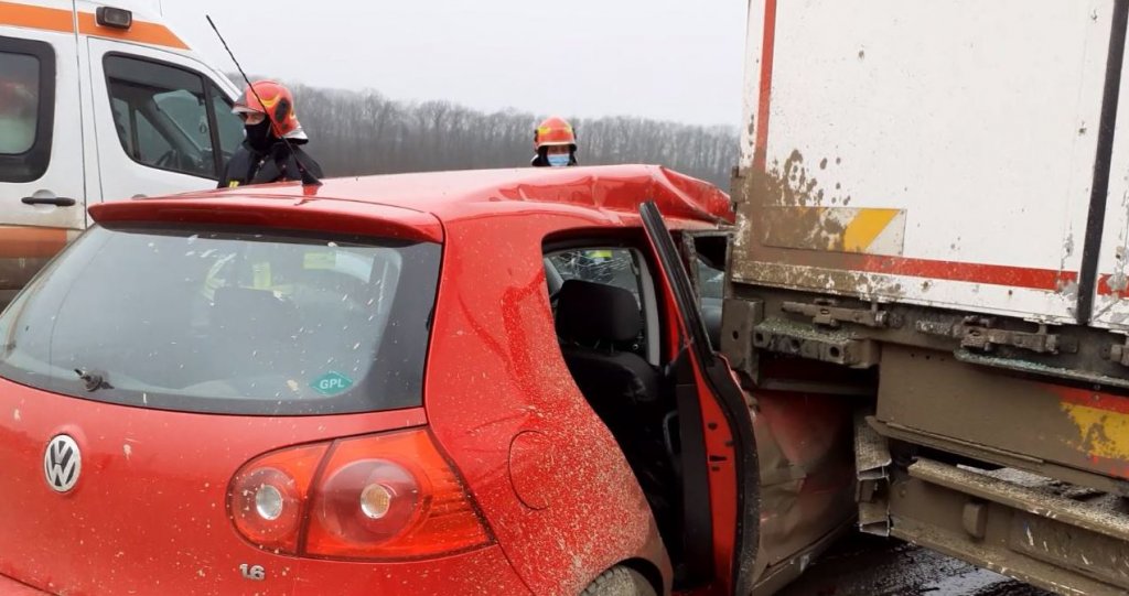 Video Foto Accident grav la Cluj. Doi răniți, după ce au intrat cu mașina sub un TIR