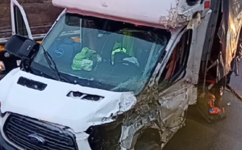 O autoutilitară și o mașină au intrat în coliziune. Ambele autovehicule s-au făcut praf.