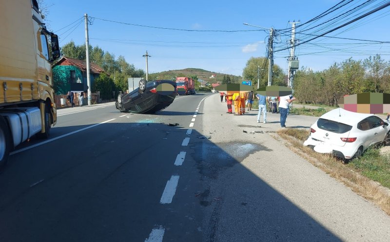 În accident au fost implicate două autoturisme dintre care una s-a răsturnat chiar în mijlocul drumului.