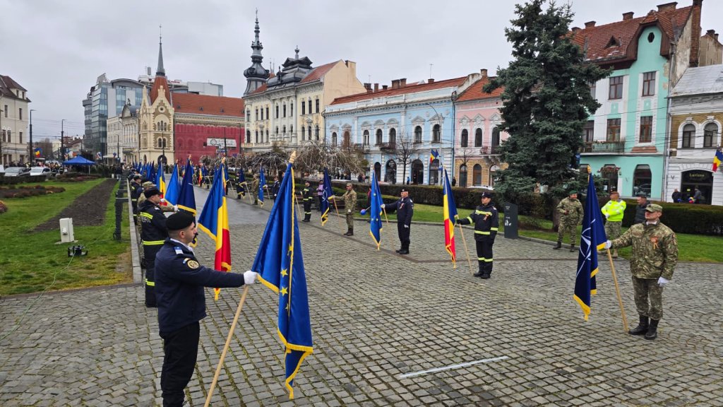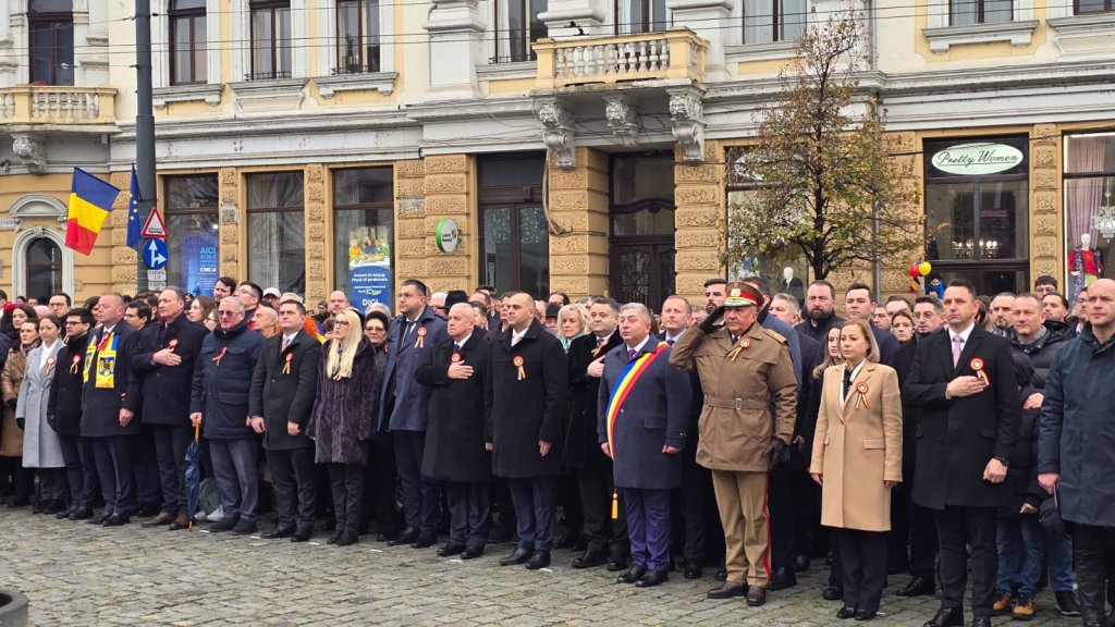 Manifestările de Ziua Națională a României au început la Cluj-Napoca cu o ceremonie de depunere de coroane și jerbe de flori în Piața Mihai Viteazul.