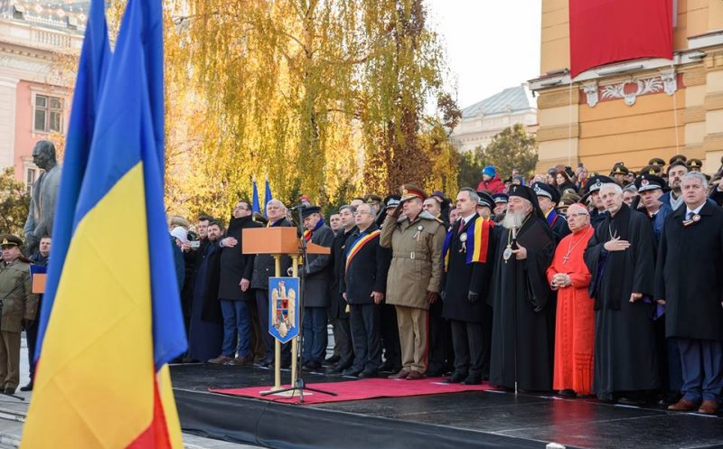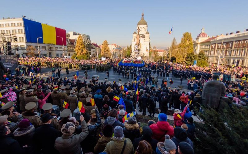 Manifestările dedicate Zilei Naţionale a României au început cu depunerea de coroane de flori la statuia lui Mihai Viteazu, în premieră în Cluj-Napoca şi au continuat cu padara militară în Piaţa Avram Iancu. La intonarea Imnului Naţional, alpiniştii militari au desfăşurat un tricolor uriaş pe clădirea Cercului Militar.