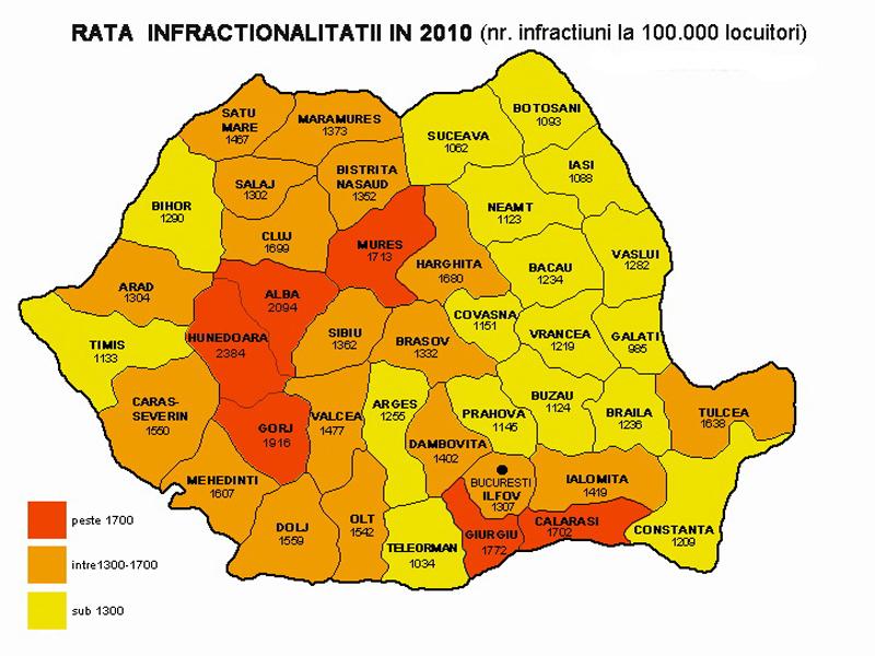 Potrivit datelor INS, rata infracţionalităţii în România în anul 2010 a fost de 1.366 de infracţiuni la 100.000 de locuitori, puţin în scădere faţă de 2009, când a fost de 1.397. Statisticile arată că, în total, anul trecut au fost circa 293.000 de infracţiuni în toată ţara. În acelaşi timp, rata criminalităţii - persoane condamnate definitiv la 100.000 de locuitori - a fost de 195, în creştere faţă de 2009. Pe judeţe, rata infracţionalităţii variază între un minim de 985 în judeţul Galaţi şi un maxim de 2.384 în Hunedoara. Alături de acest judeţ, Alba, Mureş, Gorj, Giurgiu şi Călăraşi au o rată de peste 1.700 de infracţiuni la suta de mii de locuitori. Clujul este chiar primul sub limita de 1.700, cu o rată a infracţionalităţii de 1.699, făcând parte dintr-un grup de 17 judeţe plus Bucureştiul, ce au o rată între 1.300 şi 1.700. În această categorie regăsim şi Doljul, cu 1.559, un judeţ intens mediatizat pentru infracţiunile violente din Craiova. În mod surprinzător, toate judeţele din Moldova, unde au loc numeroase crime, violuri şi alte violenţe, au o rată între 1.000 şi 1.300 de infracţiuni la 100.000 de locuitori.