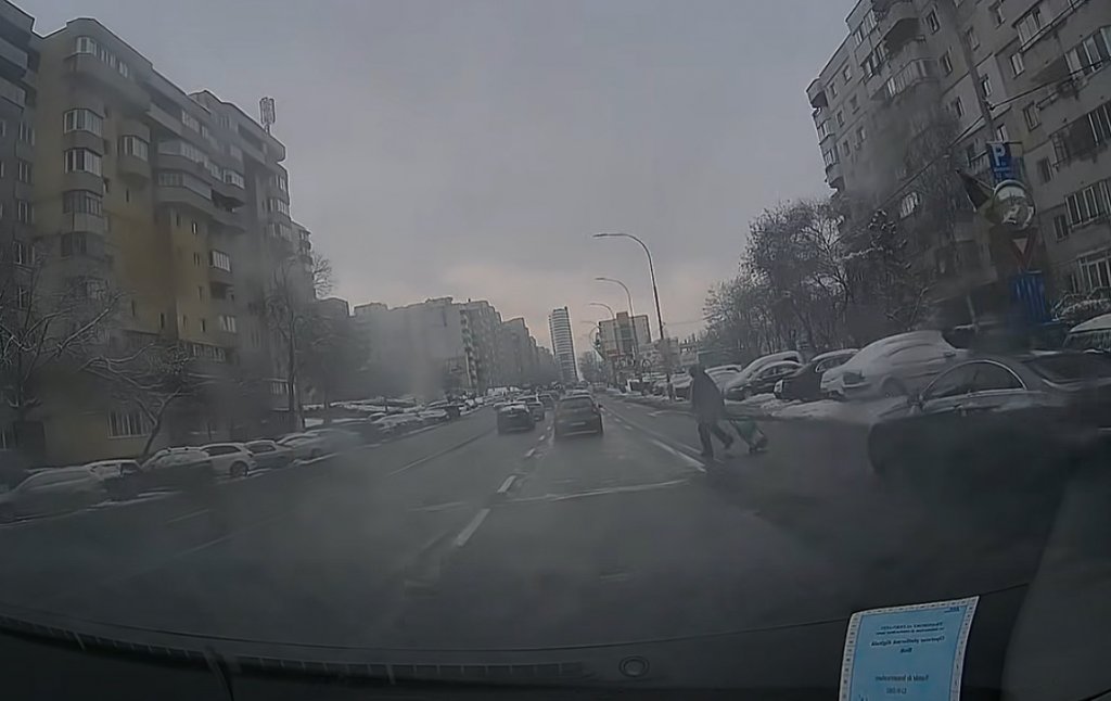 Un șofer din Cluj-Napoca s-a trezit cu un pieton în fața mașinii pe condiți meteo numai bune de accidente. Individul, care mai căra și un căruț uriaș după, el a ajuns până pe banda a doua în zona podului Calvaria, pe Calea Florești.