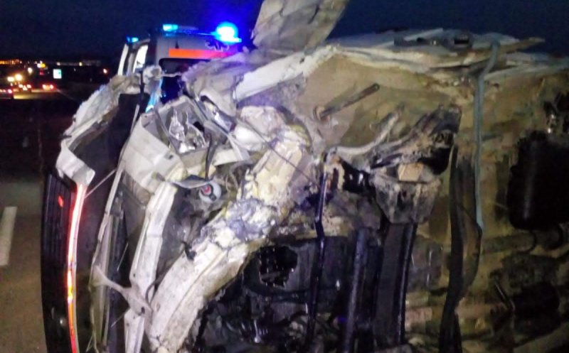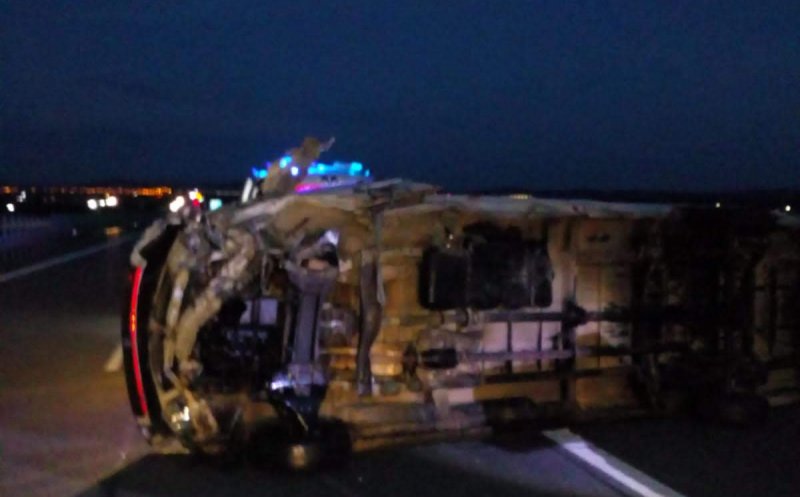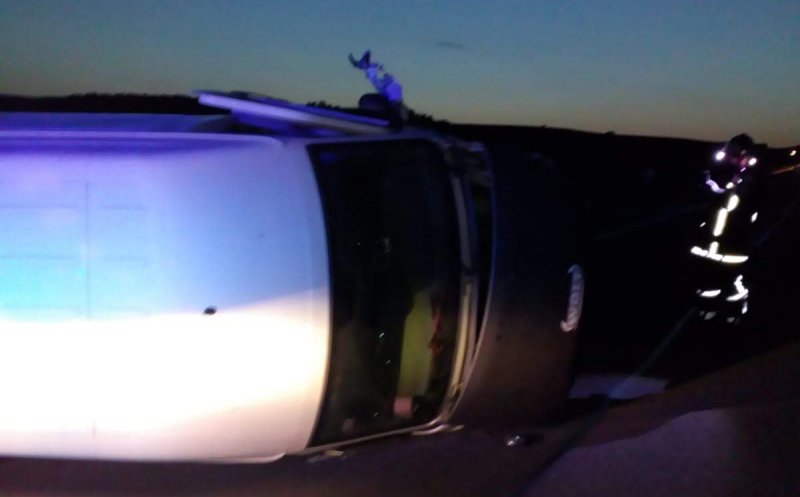 O autospecială cu modul de descarcerare al ISU a intervenit, duminică seara, în cazul unei autoutilitare care s-a răsturnat pe A3.