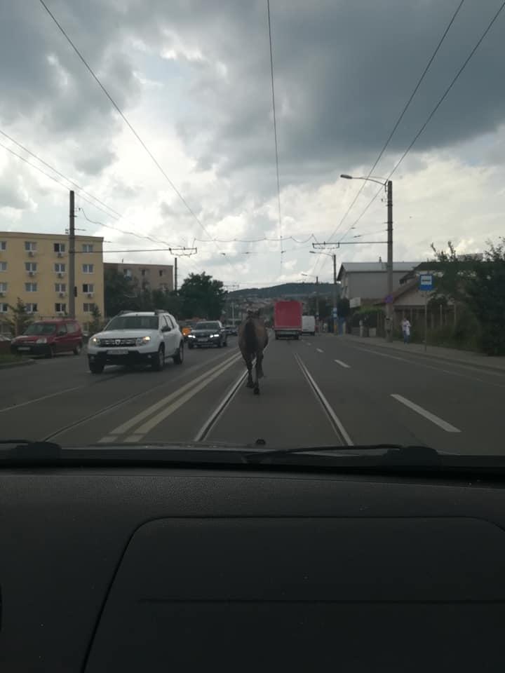 Calul a fost surprins hoinărind singur, pe Bulevardul Muncii din Cluj-Napoca. Oamenii au postat câteva imagini cu animalul care rătăcea printre mașini.