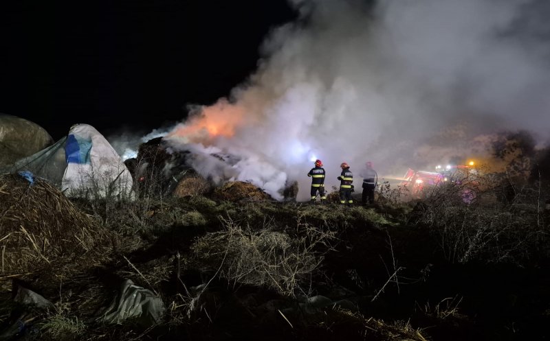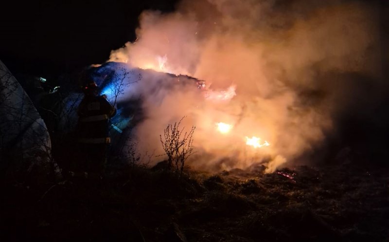 UPDATE ora 20:40: "Intervenția este în continuare în desfășurare. Flăcările au cuprins aproximativ 50 de baloți de fân, incendiul fiind localizat. Se lucrează pentru lichidare. De asemenea, pompierii, ajutați de către persoanele aflate la fața locului, au reușit să evite propagarea focului la alți 100 de baloți de fân. Cel mai probabil, incendiul a izbucnit din cauza unei scântei produse de către o drujbă, în timpul utilizării", a transmis ISU Cluj.