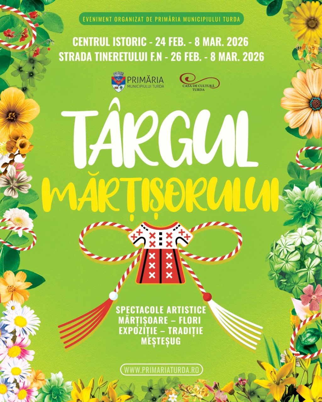 "Primăria Municipiului Turda și Casa de Cultură Turda anunță deschiderea oficială a evenimentului 'Târgul Mărțișorului', care se va desfășura în perioada 24 februarie – 8 martie 2026.