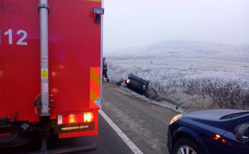 Foto Mașină răsturnată pe varianta Vâlcele - Apahida. Drumul era acoperit cu polei