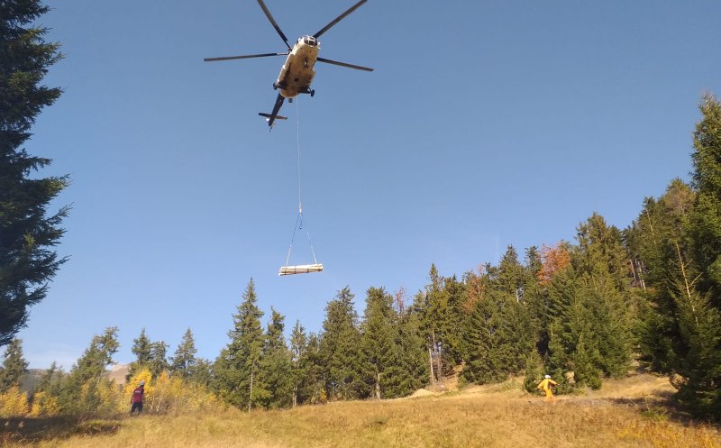 Un echipaj de piloți de la Unitatea Specială de Aviatie Cluj-Napoca, a transportat cu elicopterul 10 tone materiale și unelte necesare construirii unui refugiu montan în Parcul Național Munții Rodnei.