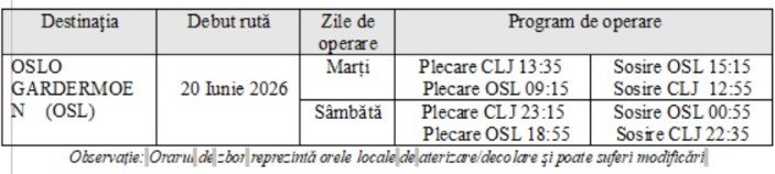 Începând din 20 iunie 2026, compania aeriană Norwegian va conecta orașul Cluj-Napoca cu capitala Norvegiei, Oslo, prin intermediul zborurilor spre cel mai mare aeroport din această țară, Oslo Gardermoen.
