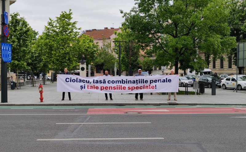 Manifestanții au afișat un banner pe care scria: „Ciolacu, lasă combinațiile penale și taie pensiile speciale!”.