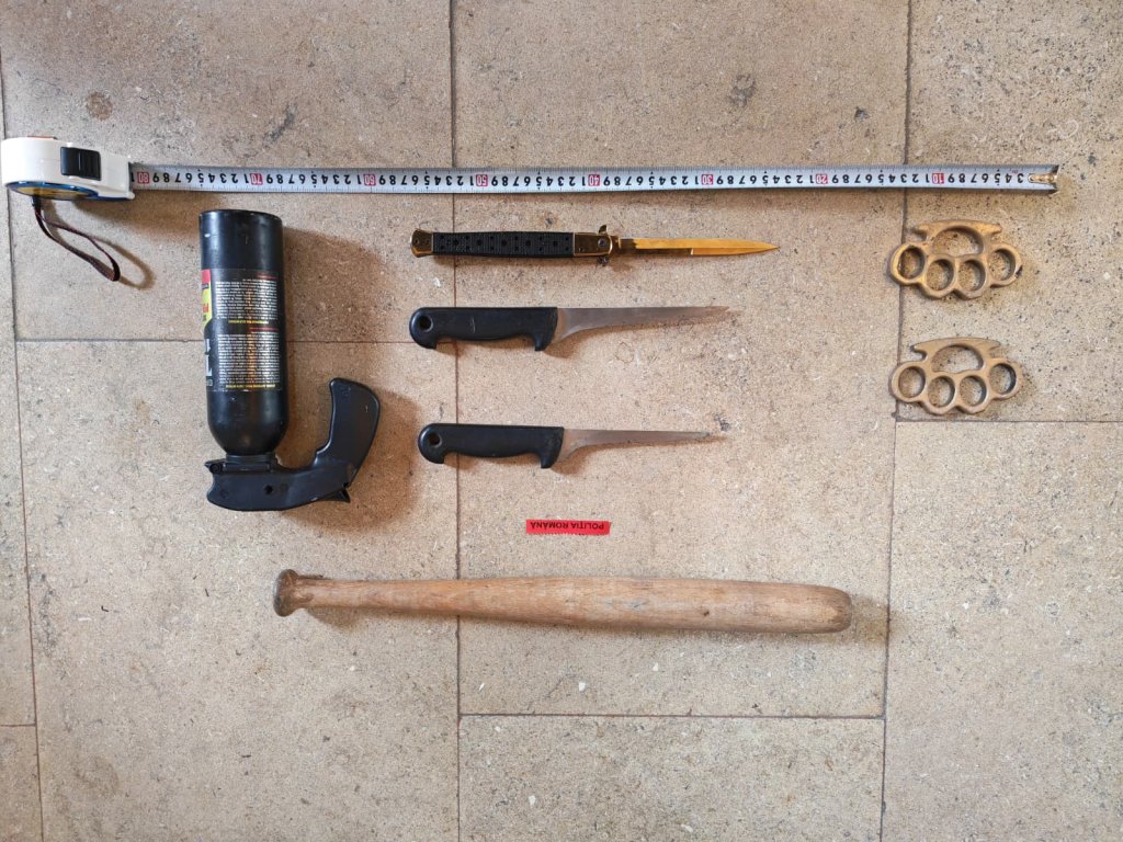 Cu ocazia controlului autovehiculelor, într-unul dintre acestea au fost descoperite obiecte susceptibile a fi utilizate în comiterea de fapte antisociale, respectiv o bâtă din lemn, două cuțite, un spray iritant-lacrimogen, un briceag și două obiecte tip pumnal-box, acestea fiind ridicate în vederea continuării cercetărilor.