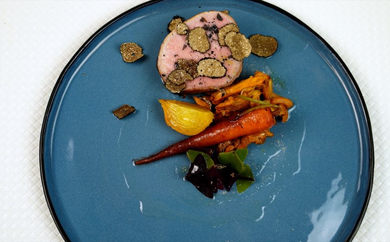 4. Galiță de ocol: cocoșel cu porumb copt, cartofi confiați, ciupercă murată și sos brun servite alături de un pahar de Fetească Regală