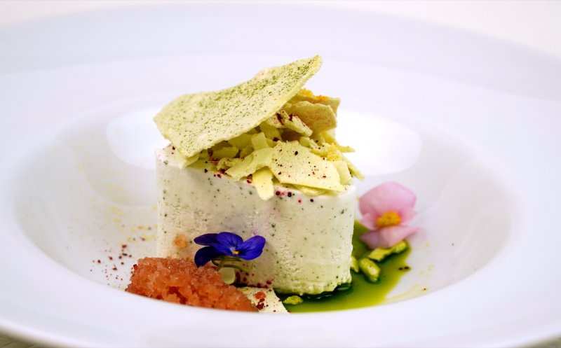7. Pastel: Parfait de smochine, ulei de frunze de smochine, granita servite alături de un pahar de Castel Huniade Roze