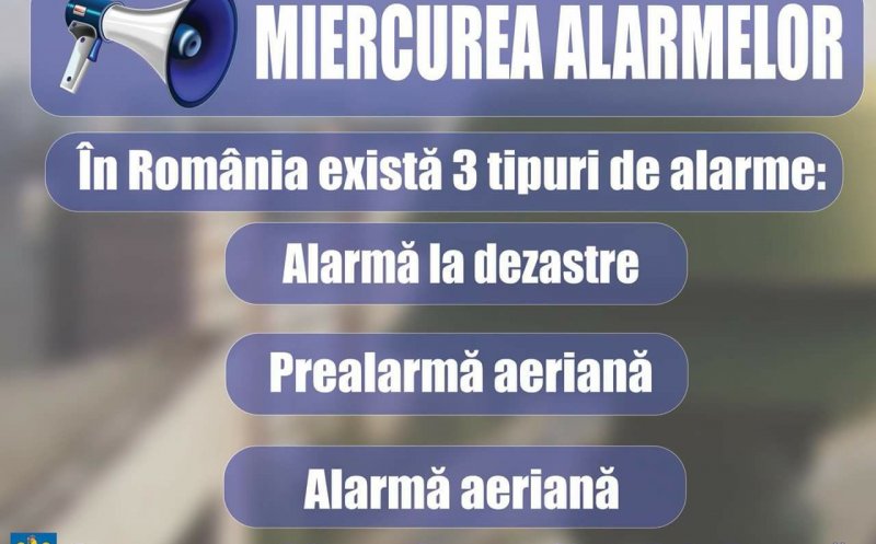 Inspectoratul General pentru Situații de Urgență continuă să desfășoare, în prima zi de miercuri a fiecărei luni, exercițile naționale de alarmare. Astfel, începând cu ora 10.00, va avea loc un nou exercițiu “Miercurea Alarmelor”. Sirenele din țară vor emite semnalul „Alarmă aeriană”, care are rolul de prevenire a populației civile asupra iminenței producerii unor evenimente cu impact major asupra comunităților.