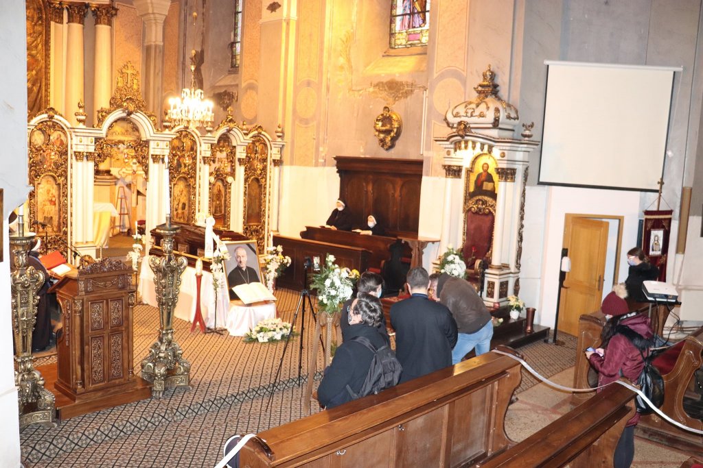 În strană, s-au rugat Surorile Ordinului „Sfântului Vasile cel Mare”, apoi Surorile din Congregația Surorilor Maicii Domnului. Pe un ecran, s-au derulat imagini cu momente importante din viața PS Florentin Crihălmeanu.