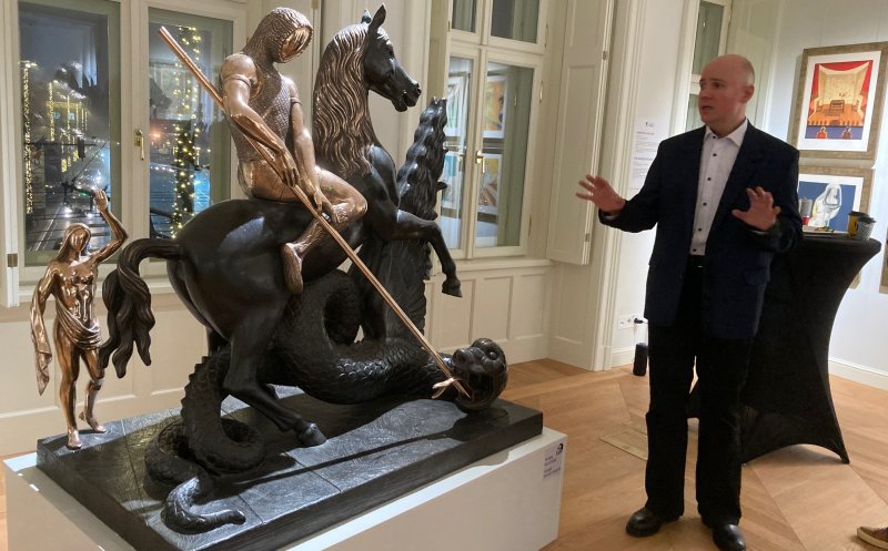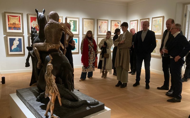 Una dintre cele mai importante piese expuse la Cluj este sculptura monumentală din bronz Saint George and the Dragon. Concepută în 1977, această lucrare reinterpretată de Dalí transformă legenda tradițională într-un simbol suprarealist al luptei dintre bine și rău. Detalii precum aripile dragonului metamorfozate în flăcări sau limba în formă de cârjă, un simbol preferat al artistului, reflectă stilul său unic. O versiune de dimensiuni mai mari a acestei capodopere a fost oferită în 1995 Papei Ioan Paul al II-lea de către Dalí Universe, fiind inclusă în colecția Vaticanului, consolidând astfel importanța culturală și artistică a acestei lucrări. În conexiune cu istoria Clujului, farmacia din Casa Hintz, care găzduiește expoziția, a purtat cândva numele „Farmacia Sfântul Gheorghe,” iar familia actualului moștenitor a realizat o statuetă din porțelan inspirată de această sculptură care poate să fie văzută încastrată în clădire și protejată de sticlă.