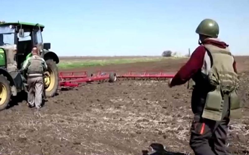 Ucrainenii au început aratul și semănatul, echipați cu veste antiglonț și căști. Înaintea lor, pe câmp merg pirotehniștii și îndepărtează bombele neexplodate.