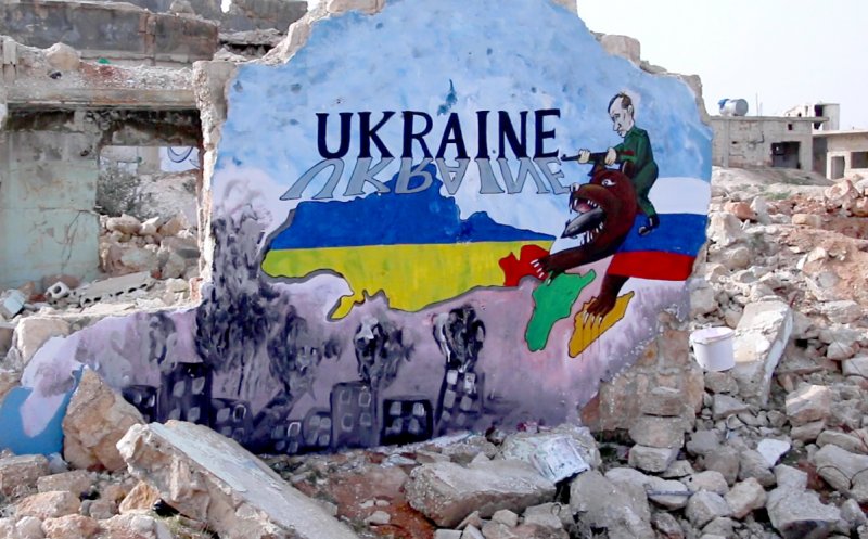 În orașul Binnish din provincia Idlib din nord-vestul Siriei, artistul de graffiti Aziz Al-Asmar a pictat o pictură murală pe o casă care a fost distrusă într-un raid aerian rusesc pentru a fi alături de poporul ucrainean după atacul declanşat de Moscova împotriva Ucrainei.