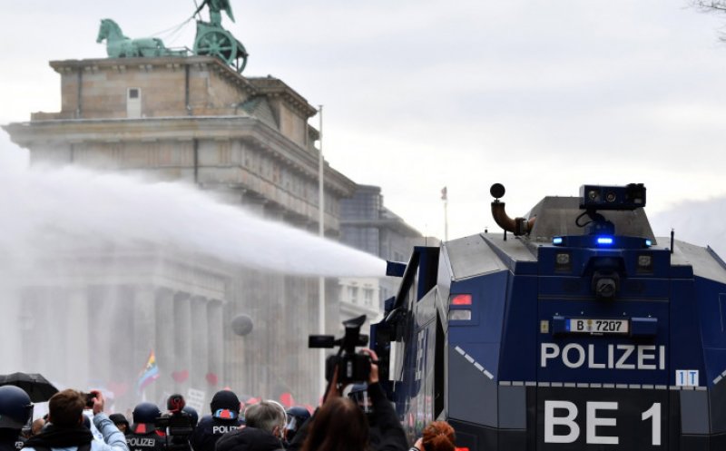 Poliția a folosit tunurile de apă pentru a dispersa manifestarea. Cu puțin timp înainte, poliția a ordonat dizolvarea acestei manifestări la care participau între 5.000 și 10.000 de persoane, în apropiere de poarta Brandeburg, în centrul capitalei, după ce le-au cerut anterior să respecte măsurile de distanțare socială.